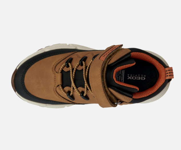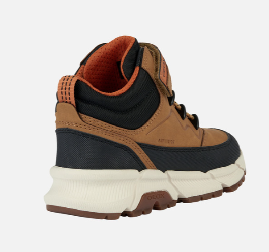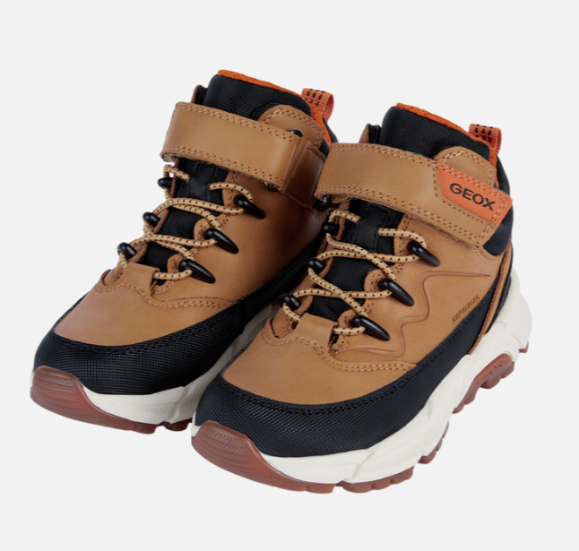 Baskets garçon imperméable Lacet élastiqué et velcro Boots enfant Tex respirant et résistant GEOX Flexyper coloris camel et noir