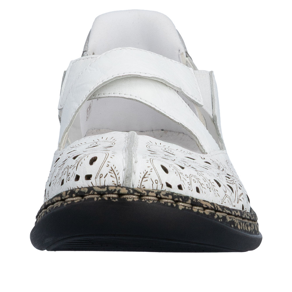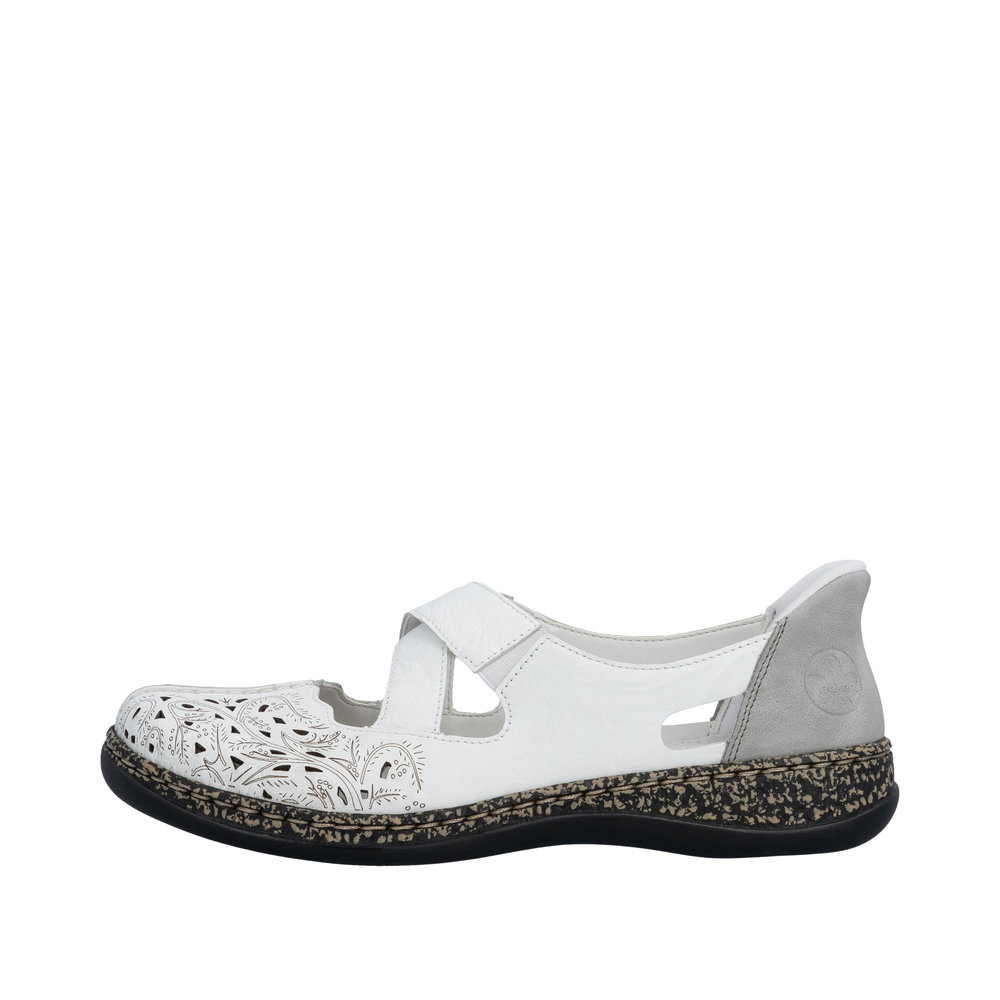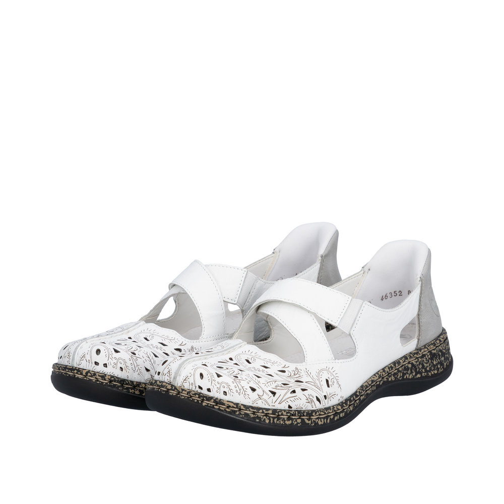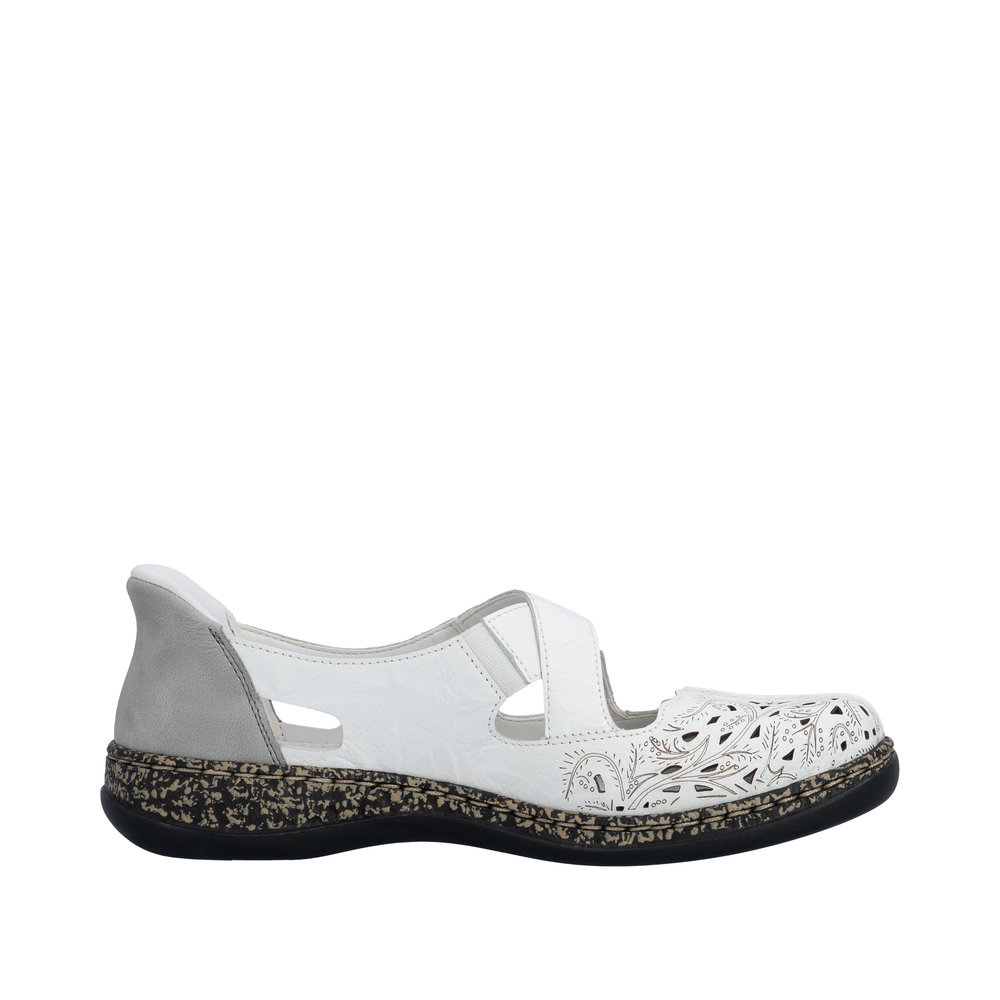Ballerine cuir femme Brides élastiquées Mocassin dame Talon plat Grande largeur RIEKER 46352-80 Coloris blanc/gris