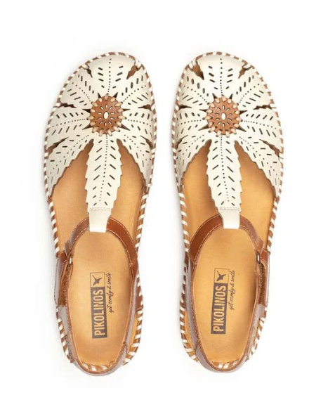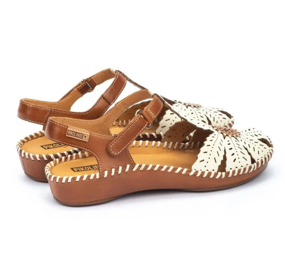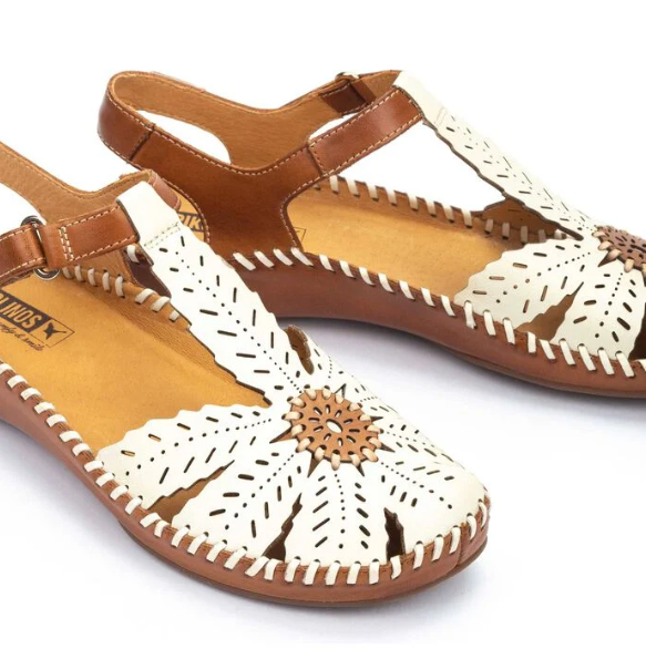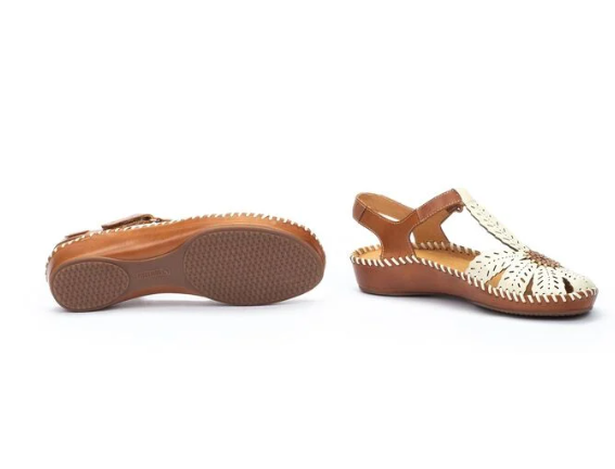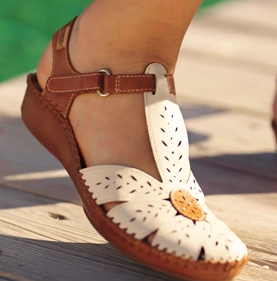 Ces souliers PIKOLINOS sont fabriquées de façon artisanales en cuir alliant élégance et confort. Ces chaussures, conçues avec un cuir de haute qualité, se distinguent par une belle harmonie de couleurs marron et beige. Le dessus de ces sandales évoque une rosace, formant un motif délicat et harmonieux. Les orteils sont cachés mais l’avant n’est pas complètement fermé, ce qui permet une bonne aération du pied.