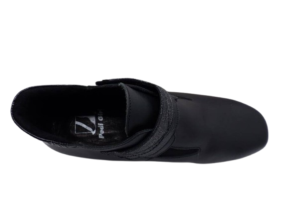 Ces sneakers PEDI GIRL pour femme en cuir noir conjuguent élégance et praticité. À mi-chemin entre le mocassin et la bottine, elles séduisent par leur ligne épurée, sans couture sur le dessus, qui leur confère un style sobre. La fermeture par Velcro, facile à ajuster, est mise en valeur par un empiècement vernis fantaisie, également présent au niveau du talon, pour une touche de modernité.