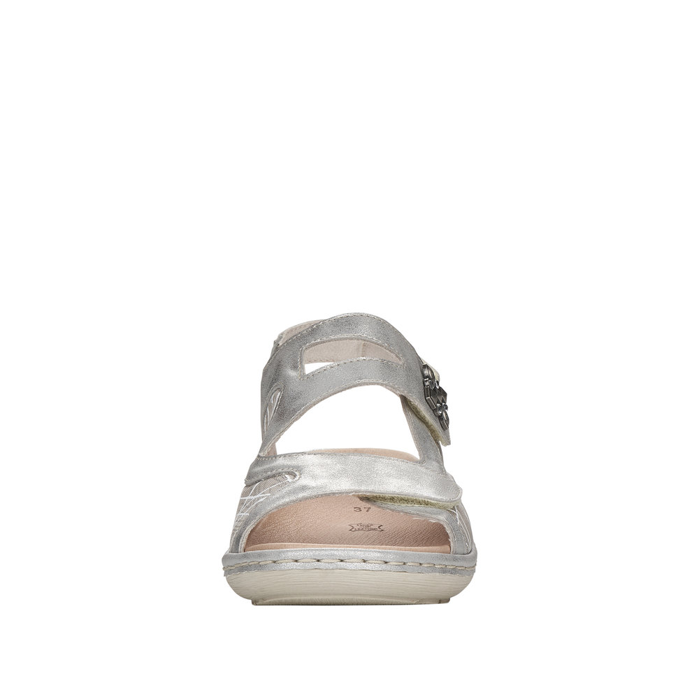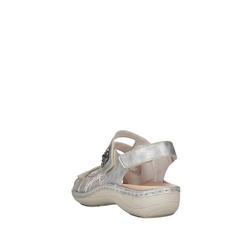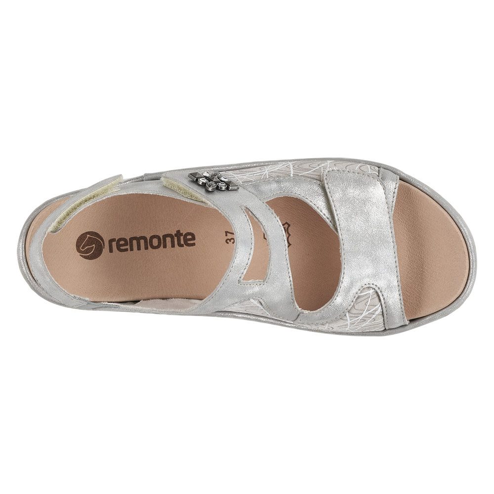 Sandales confort femme Velcro Semelle cuir Textile stretch Chaussant large Nu-pied dame REMONTE D7647 Coloris gris argenté
