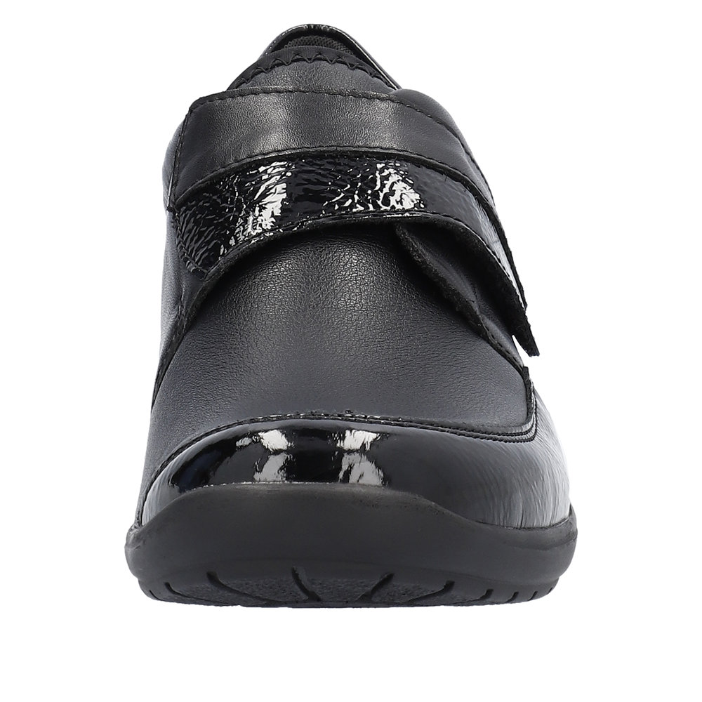 Découvrez les derbies REMONTE conçus pour pour soulager les pieds sensibles. Ces chaussures sont idéales pour un usage quotidien tout en apportant une touche raffinée à votre tenue. Elles se distinguent par leur design soigné, associant un dessus en cuir avec un pourtour avant et un talon en vernis. Le plateau et les côtés, en cuir noir mat, présentent un contraste subtil et élégant. La bande auto-agrippante, qui assure un bon maintien, tout en reprenant le design de l’ensemble. À l’intérieur, la doublure textile garantit un confort optimal, tandis que la semelle intérieure en cuir sur mousse garde les pieds dans un environnement sain. Cette semelle, amovible, peut être remplacée par une orthèse pour un ajustement personnalisé. Le talon compensé assure une marche stable tout au long de la journée, tout en donnant une allure élancée. Pour faciliter l’insertion du pied, ces derbies confort se ferment à l’aide d’une bride scratch sur le dessus. Ce modèle est particulièrement adapté pour les pieds souffrant de déformations telles que les hallux valgus. Grâce à sa zone extensible, ces chaussures offrent un chaussant confortable, permettant de réduire la pression sur les zones sensibles du pied. Cette conception soigneusement étudié aide à prévenir les irritations et offre un confort accru pour celles qui ont besoin d’un peu plus d’espace et de flexibilité au niveau des orteils.