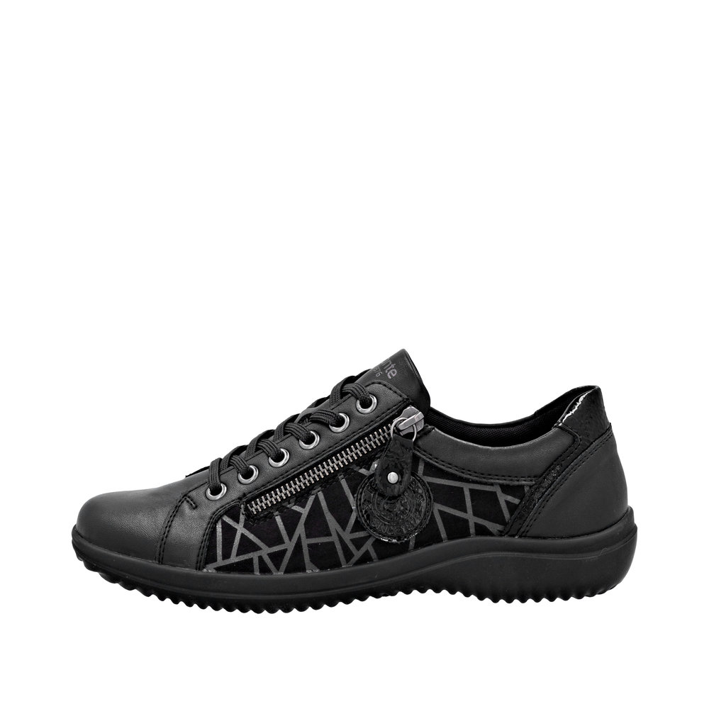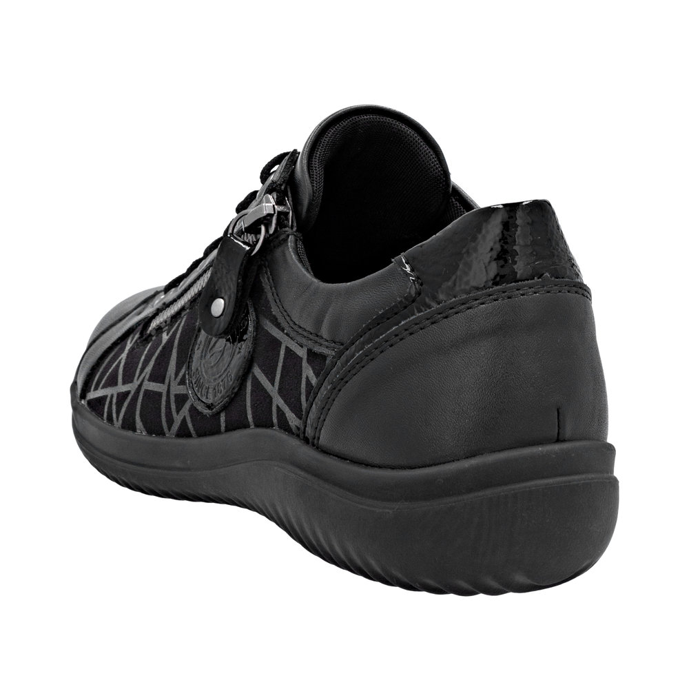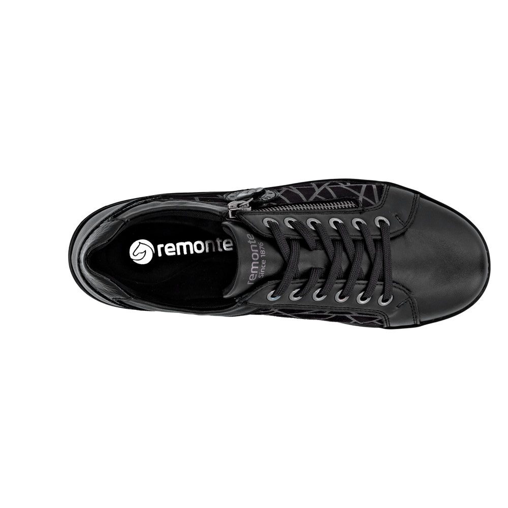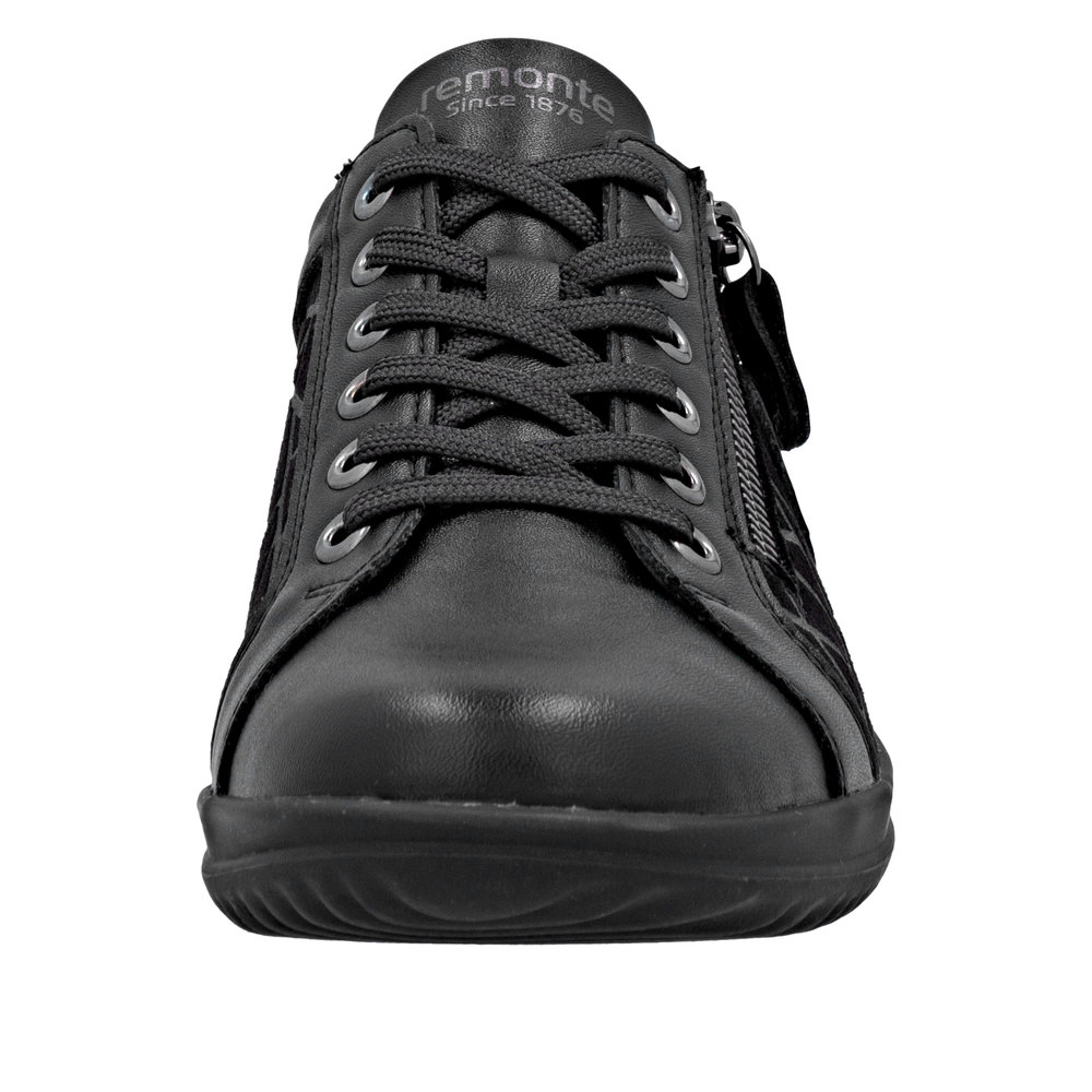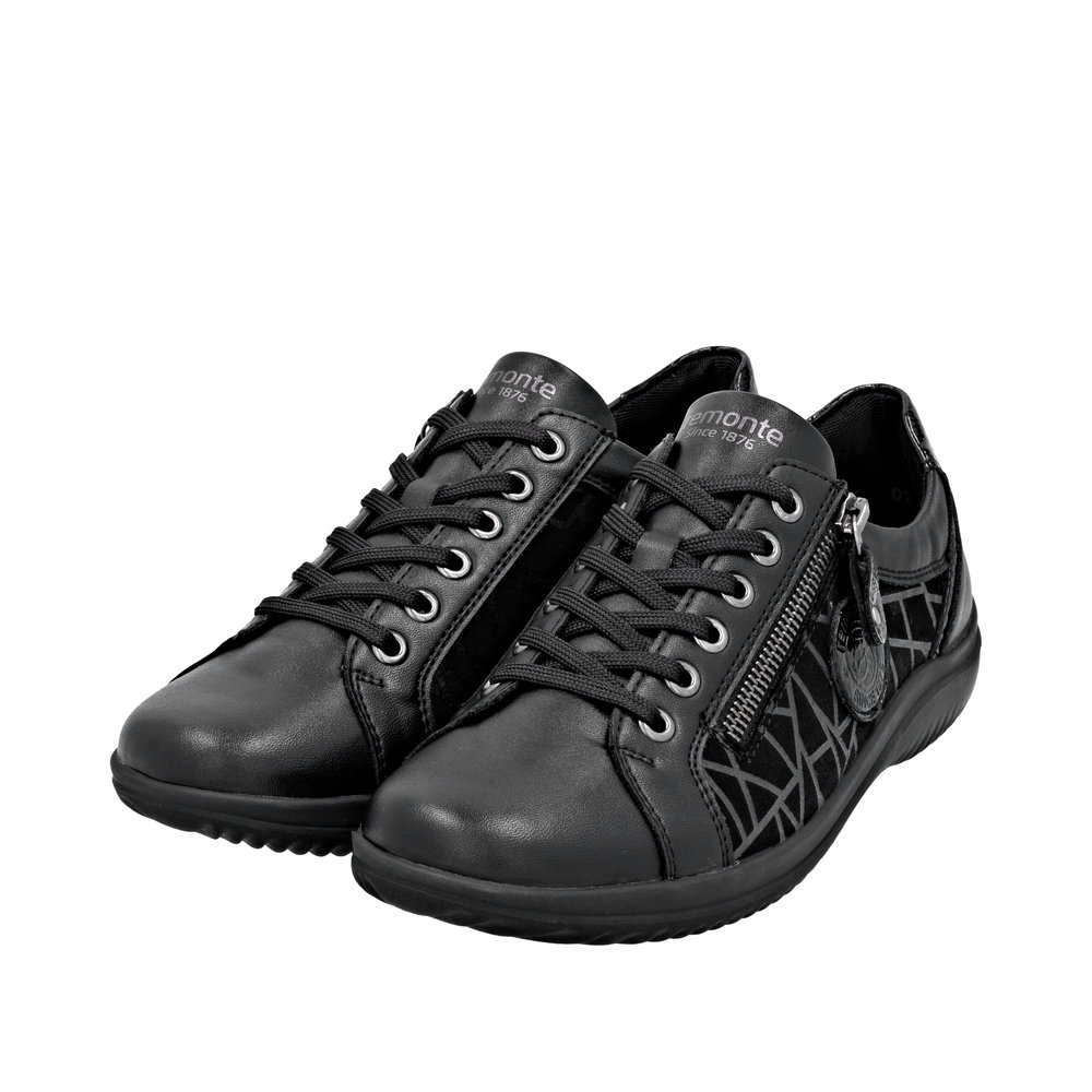 Tennis Faux cuir Végan femme Talon plat Semelle intérieure amovible Lacet + zip Chaussant large REMONTE Coloris noir