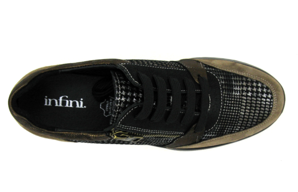La sneaker femme INFINI (ex INEA) se distingue par l’élégance de ses empiècements en velours et cuir lisse. Ces baskets modernes, entièrement conçues en cuir et doublées cuir, offrent un confort respirant et durable, idéal pour un usage quotidien. Dotées d’un laçage classique associé à un zip latéral pratique, ces chaussures se chaussent facilement. Le talon compensé discret élance la silhouette et garantit une marche stable et agréable. Avec son mélange de teintes kaki et ses reflets dorés subtilement associés à un imprimé pied-de-poule chic, cette paire de tennis revisite les codes urbains et décontractés avec une note raffinée. La semelle intérieure amovible peut être remplacée très facilement par une semelle de votre choix.