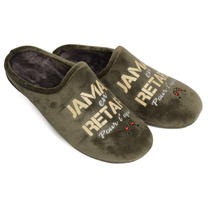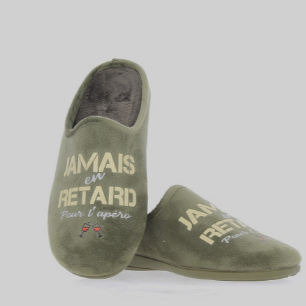 Mule chaude homme Semelle souple légèrement compensée Message humoristique sur fond kaki « JAMAIS EN RETARD POUR L’APERO » LA MAISON DE L’ESPADRILLE Coloris vert